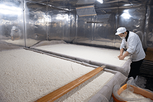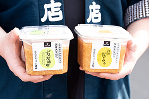 白河市といえば、白河の関が置かれて以来、みちのくの玄関口として知られており、松平定信で有名な白河藩があった場所です。藩の繁栄とともに米の生産量が増え、酒づくりも盛んとなり、麹の需要が高まりました。こうして白河には多くの麹店が誕生しました。そのひとつが「山口こうじ店」。白河で150年以上も麹を作り続けています。山口こうじ店の味噌は、福島県産米の米麹・自社生産の大豆・厳選した五島の塩のみで作られており、全国味噌鑑評会で3年連続理事長賞を受賞するなど高い評価を受けています。丁寧に洗った米に麹菌を吹き付け、温度と湿度を管理した室に保管します。ここでの菌糸が伸びて麹になる“立ち上げ”が麹づくりにおいてもっとも重要な工程だと言われます。温かく、甘い香りがただよう室の中で完成した麹と、すり潰した大豆、塩を合わせ、大きな容器の中で発酵・熟成させます。山口こうじ店では、一般的な味噌に比べて麹を1.2倍ほど多く使っていることに加え、麹の粒を潰さずに商品にすることで、麹の甘みを感じられる味噌に仕上げているそうです。たんぱく質含有量が多い大豆「エンレイ」の旨みが堪能できる「白河関のみそ」、希少な青大豆「秘伝」のさわやかさとコクが特徴の「ずんだ味噌」の2種類の味噌があり、どちらも同じ製造工程なのですが、豆の違いによって味が大きく変わるため、食べ比べを楽しむことができます。