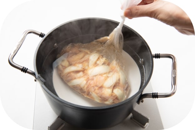 湯せんで加熱するポリ袋調理。