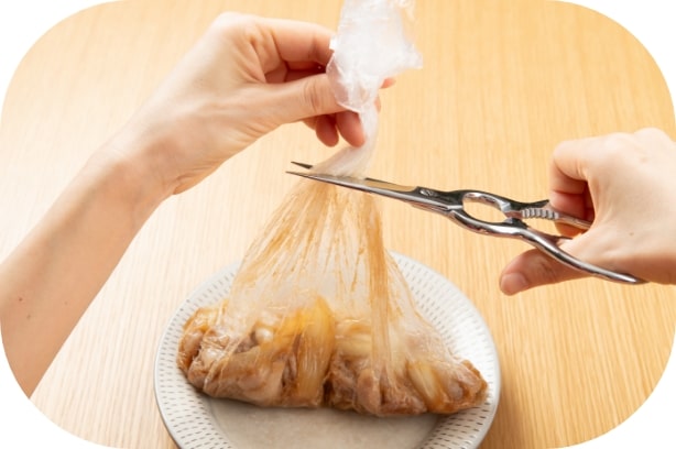 しっかり火が通ったら、結び目の下をキッチンばさみで切って器に出す。 ※災害時は、ポリ袋を鍋に入れてから火をつける